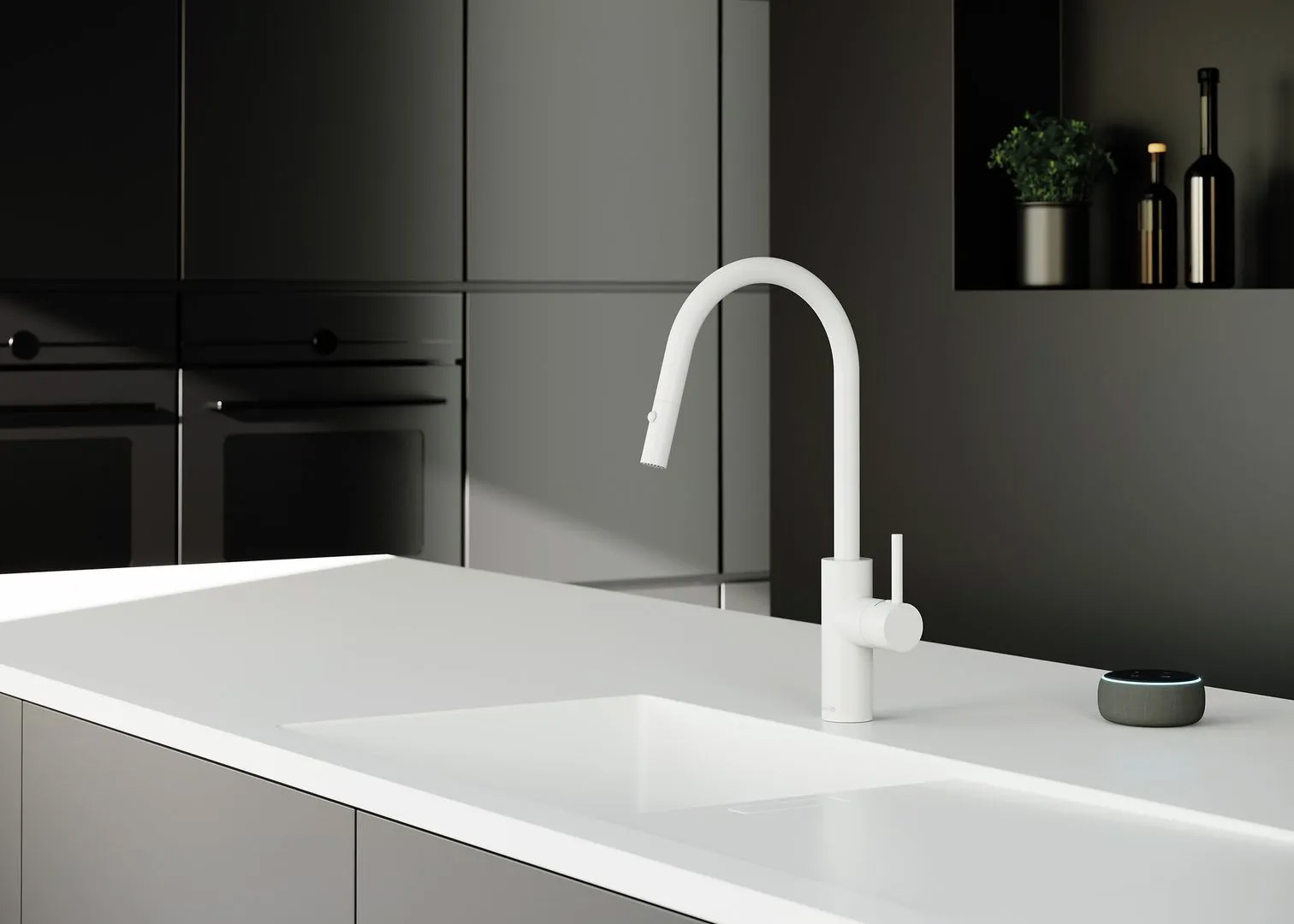 Hingucker an der Küchenspüle: Mit ihrer hochgewachsenen Gestalt und ihrem filigranen Design zieht Kludi-E-GO Voice die Blicke auf sich. Dies gilt vor allem für die Varianten in edlem Mattschwarz oder angesagtem Mattweiß. Besonders praktisch für die Küchenarbeit: die herausziehbare Geschirrbrause mit zwei Strahlarten.
